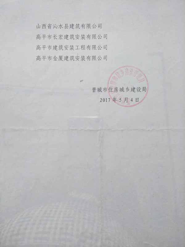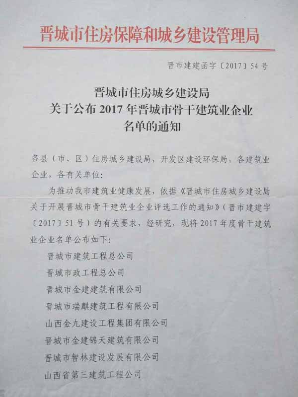 2017年5月4日,接晉城市住房城鄉(xiāng)建設局有關通知,晉城市金建建筑有限公司入選2017年晉城市骨干建筑業(yè)企業(yè)名單。2017年晉城市骨干建筑業(yè)企業(yè)自公布之日起,“骨干建筑業(yè)企業(yè)”稱號有效期一年。今后,每年評選一次,每年****季度評選完成,“骨干建筑業(yè)企業(yè)”稱號有效期一年。